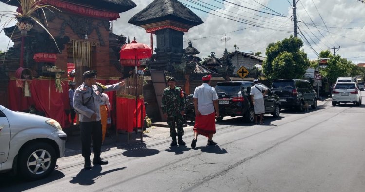 Klungkung, - Dalam rangka memberikan rasa aman dan nyaman kepada masyarakat, Babinsa Koramil Klungkung, Serka Ketut Sudarma melakukan pengamanan kegiatan piodalan di Pura Kawinan Penataran Pande Kuribatu, Desa Tojan, Kecamatan Klungkung, Sabtu (18/4).